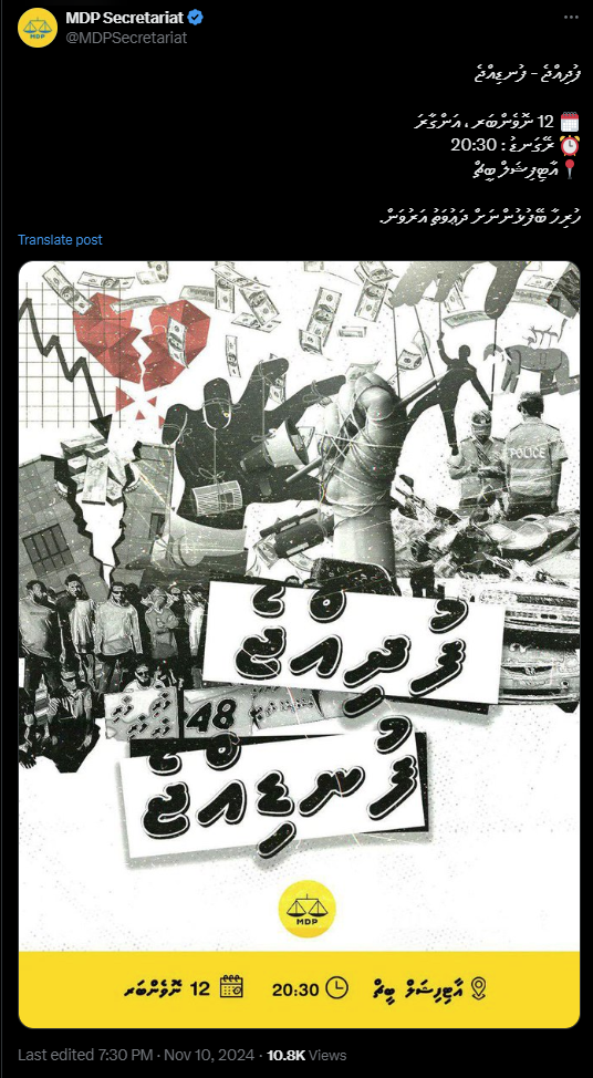 ”ފުދިއްޖެ، ފުނޑިއްޖެ“ ނަމުގައި ބޮޑު ޖަލްސާ މާދަމާރޭ އާޓިފިޝަލް ބިޗްގައި ބޭއްވުމަށް އިދިކޮޅު މައި ޕާޓީ މޯލްޑިވިއަން ޑިމޮކްރެޓިކް ޕާޓީ (އެމްޑީޕީ) އިން އިއުލާނުކޮށްފި އެވެ. މިކަން އިޢުލާނުކޮށްފައިވަނީ އެމްޑީޕީގެ ރަސްމީ ”އެކްސް“ އެކައުންޓުން ކުރި ޕޯސްޓެއްގައެވެ. އެފޯސްޓުގައި ބަޔާންކޮށްފައިވަނީ ”ފުދިއްޖެ، ފުނޑިއްޖެ“ ގެ ނަމުގައި ބާއްވާ ޖަލްސާ އޮންނާނީ މާދަމާ 12 ނޮވެންބަރު 2024 (އަންގާރަ) ދުވަހުގެރޭ 8:30 ގައި އާޓިފިޝަލް ބީޗް ސަރަހައްދުގައި ކަމަށެވެ. އެކްސްގައި ކޮށްފައިވާ ފޯސްޓުގައި، ޖަލްސާގައި ބައިވެރިވުމަށް ރައްޔިތުންނަށް ވަނީ ދައުވަތު ދީފަ އެވެ.