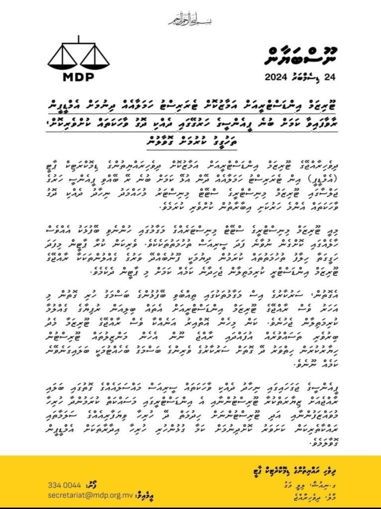 ޕީއެންސީގެ ޖަގަހައިގައި ނިހާދު ދެއްކި ވާހަކަތައް ސީރިއަސް މައްސަލައެއްގެ ގޮތުގައި ބަލައި ރާއްޖެއަށް ޒިޔާރަތްކުރާ ޓޫރިސްޓުންނާއި އެ އިންޑަސްޓްރީގައި މަސައްކަތް ކުރަމުންދާ ހުރިހާ މުވައްޒަފުންނާއި އަދި ޓޫރިސްޓުންނަށް ހިދުމަތް ދޭ ހުރިހާ ވިޔަފާރިއެއްގެ ސަލަމާތައި ރައްކާތެރިކަން ކަށަވަރު ކޮށްދިނުމަށް ކަމާ ގުޅުންހުރި ހުރިހާ އިދާރާތަކަށް އެމްޑީޕީން ގޮވާލަމެވެ. ނޫސްބަޔާންގައި ވެއެވެ.