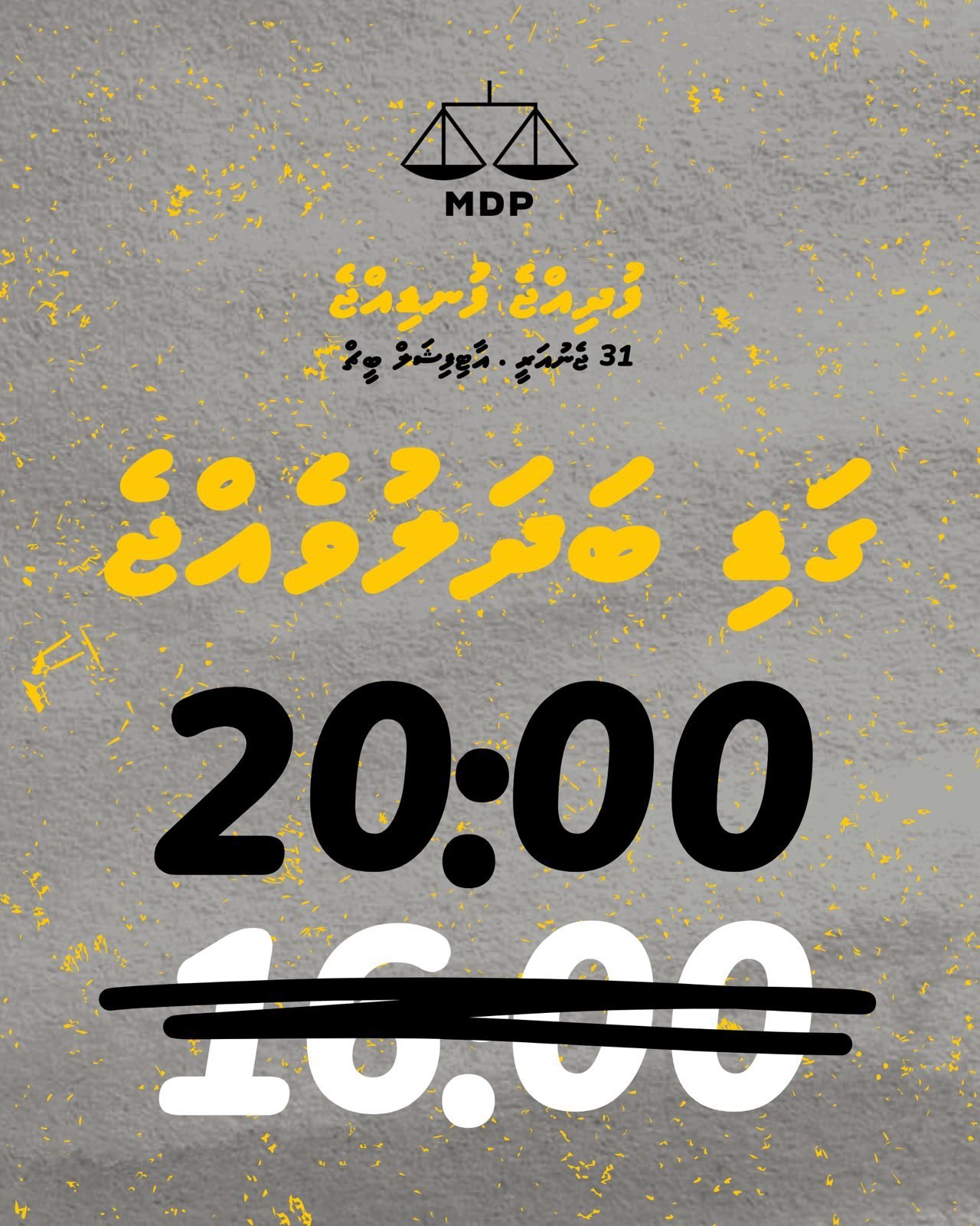 އެމްޑީޕީން މި ހިނގާލުން ބޭއްވުމަށް ނިންމީ 31 ޖެނުއަރީވާ ހުކުރު ދުވަހުގެ ހަވީރު 4:00 ގައެވެ. ނަމަވެސް އެމްޑީޕީން ވަނީ ހިނގާލުމުގެ ގަޑި ބަދަލުކޮށްފައިވާކަން ހާމަކޮށްފައެވެ. އެމްޑީޕީގެ ރަސްމީ އެކްސް އެކައުންޓުން ކުރި ޕޯސްޓެއްގައި ބުނެފައިވަނީ 31 ޖެނުއަރީވާ ހުކުރު ދުވަހުގެ ހަވީރު ބާއްވާ ހިނގާލުން އެރޭ 8:00ށް ބަދަލުވެފައިވާ ކަމަށެވެ. އަދި ކުރިންވެސް ރާވާފައިވާ ގޮތަށް ހިނގާލުމަށް މީހުން އެއްވާން ޖެހޭނީ އާޓިފިޝިއަލް ބީޗަށް ކަމަށް އެކްސްގައި ކުރި ޕޯސްޓްގައި ބުނެފައިވެއެވެ.
