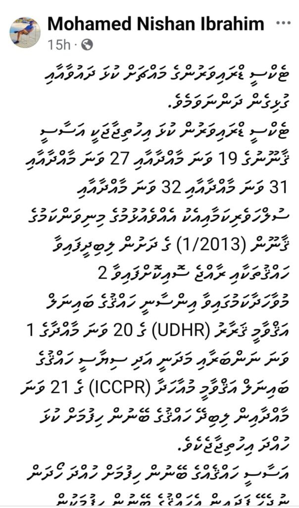 ވަކީލް ނިޝާނު ދައުލަތައް ގޮވާލައްވައިފަނީ ނިޝާންގެ ފޭސްބުކުގައި ކަންބޮޑުވުން ފާޅުކޮށް ހިއްސާކޮށްފައިވާ ފޯސްޓެއްގައެވެ. އެޕޯސްޓުގައި ބުނެފައިވަނީ،