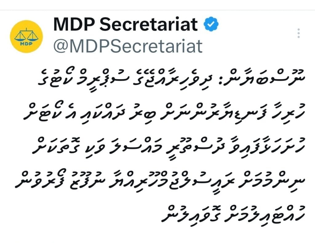 އެމްޑީޕީން ނެރުނު ބަޔާނުގައި އިތުރަށް ބުނެފައިވަނީ ދިވެހިރާއްޖޭގެ ސްޕްރީމް ކޯޓުގެ ހުރިހާ ފަނޑިޔާރުންނަށް ބިރުދައްކައި، އެ ކޯޓަށް ހުށައަޅާފައިވާ ދުސްތޫރީ މައްސަލަ ވަކި ގޮތަކަށް ނިންމުމަށް ރައީސުލްޖުމްޙޫރިއްޔާ ޑރ. މުޙައްމަދު މުއިއްޒު ނުފޫޒު ފޯރުވަމުން ދާކަމަށް ސްޕްރީމް ކޯޓުން އަންގާރަ ދުވަހު އިސްތިއުފާ ދެއްވި ފަނޑިޔާރު ޙުސްނު ސުޢޫދު ވިދާޅުވެފައިވާތީ އެ މައްސަލަ ތަޙުޤީޤުކޮށް، ފަނޑިޔާރުގެ މިނިވަން ކުރުމަށް ކުރެވެން ހުރި ހުރިހާ ކަމެއް ކުރުމަށް ދައުލަތުގެ މުއައްސަސާތަކަށް ގޮވާލާ ކަމަށެވެ.