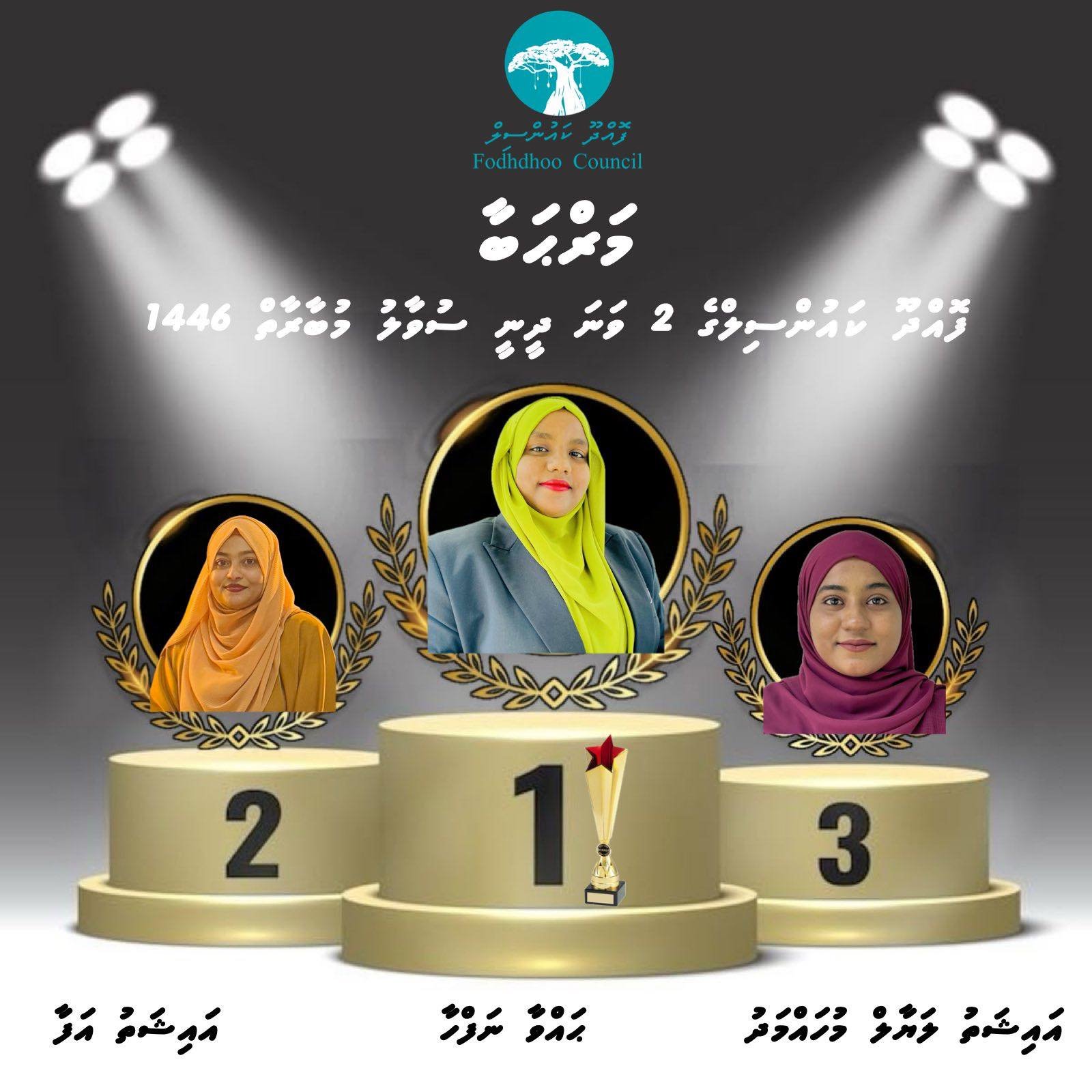 މިލަދުންމަޑުލު ދެކުނުބުރީ ފޮއްދޫ ކައުންސިލުން އިންތިޒާމްކޮށްގެން މިއަހަރު ރަމްޟާން މަހު ބޭއްވި ދީނީ ސުވާލު މުބާރާތުން އެއްވަނަ އެރަށު ނިޝާން ޙައްވާ ނަފްޙާ ހޯދައިފިއެވެ. ރައްޔިތުންގެ މެދުގައި ދީނީ ހޭލުންތެރިކަން އިތުރު ކުރުމުގެ މަޤްޞަދުގައި ފޮއްދޫ ކައުންސިލުން އިންތިޒާމްކޮށްގެން ދީނީ ސުވާލު މުބާރާތެއް ކޮންމެ އަހަރެއްގެ ރަމްޟާން މަހު ބާއްވަމުން ގެންދެއެވެ. މިއީ މިގޮތުން ބޭއްވުނު 2ވަނަ މުބާރާތެވެ. މިއަހަރުގެ މުބާރާތުން 2ވަނަ ހޯދާ ފައިވަނީ އެރަށު ގަހާ އާއިޝަތު އަފާއެވެ. ތިންވަނަ ހޯދާފައި ވަނީ އެރަށު ބަހާރުގޭ އައިޝަތު ލަޔާލު މުޙަންމަދެވެ. މިމުބާރާތުން އެއްވަނަ އަންނަ ފަރާތަކަށް ފޮއްދޫ ކައުންސިލުން ކަނޑައަޅާފައިވަނީ ޢުމުރާ ދަތުރެކެވެ.