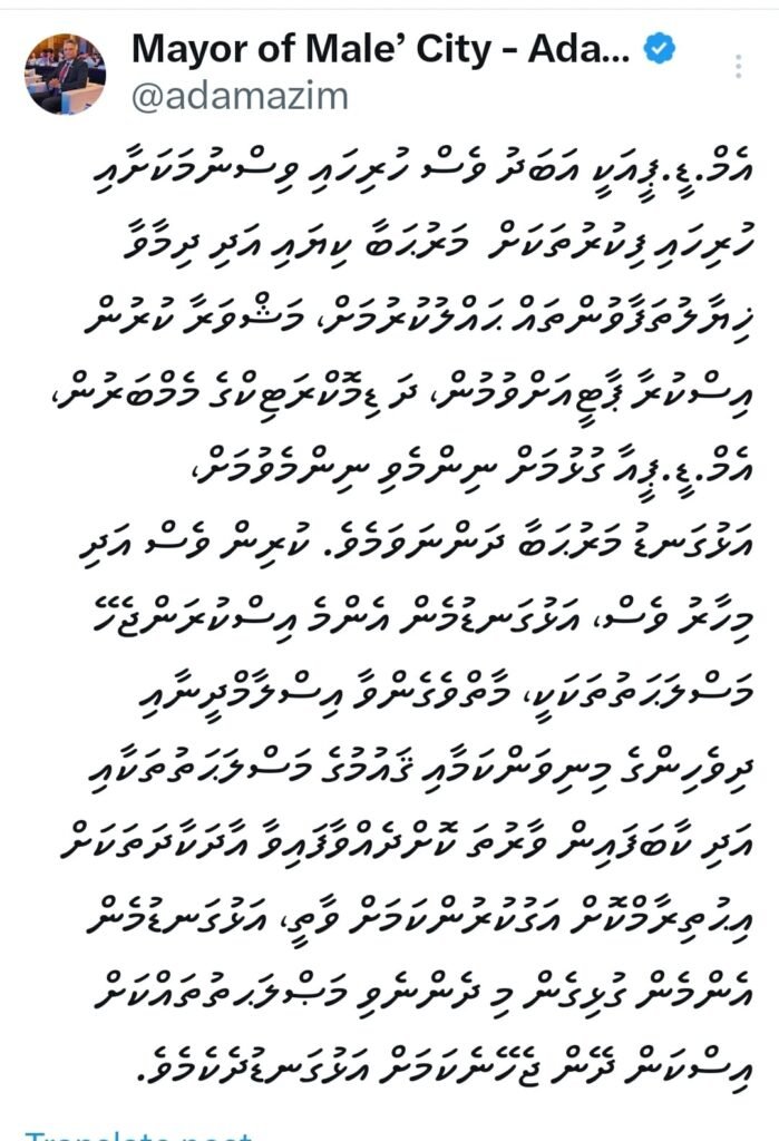 އިތުރަށް ޕޯސްޓުގައި ހިއްސާކޮށްފައިވަނީ، ކުރިން ވެސް އަދި މިހާރު ވެސް، އަޅުގަނޑުމެން އެންމެ އިސްކުރަންޖެހޭ މަސްލަޙަތުތަކަކީ، މާތްވެގެންވާ އިސްލާމްދީނާއި ދިވެހިންގެ މިނިވަންކަމާއި ޤައުމުގެ މަސްލަޙަތުތަކާއި އަދި ކާބަފައިން ވާރުތަ ކޮށްދެއްވާފައިވާ އާދަކާދަތަކަށް އިޙުތިރާމްކޮށް އަގުކުރުންކަމަށް ވާތީ، އަޅުގަނޑުމެން އެންމެން ގުޅިގެން މި ދެންނެވި މަޞްލަޙަތުތަކަށް އިސްކަން ދޭން ޖެހޭނެކަމަށް އަޅުގަނޑުދެކެމެވެ. އާޒިމް އެކްސްގައި ކުރެއްވި ޕޯސްޓުގައި ވެއެވެ.