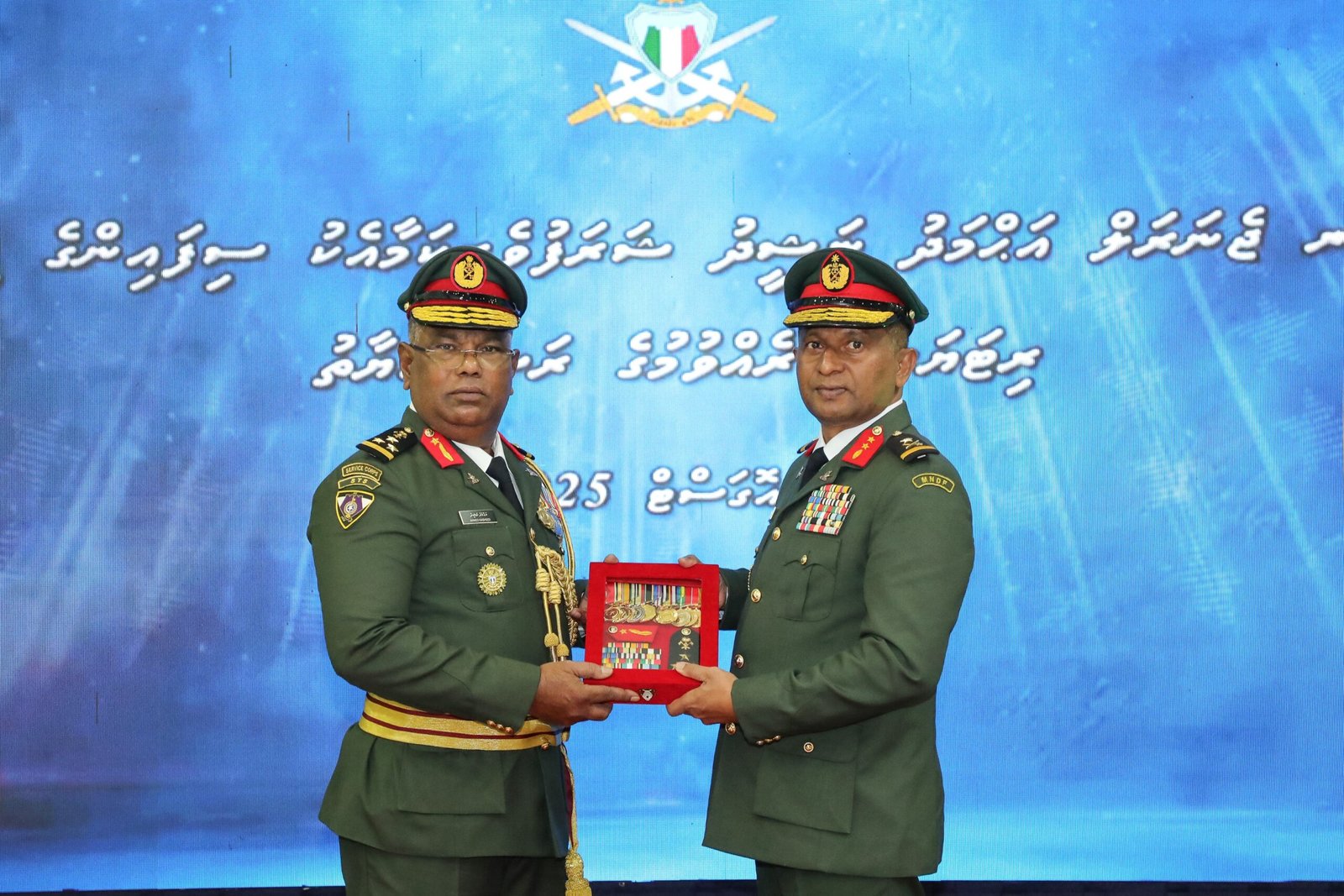 މި ރަސްމިއްޔާތުގައި، އެމްއެންޑީއެފުން ދެއްވާ ސިޓީފުޅާއި އިޚްލާޞްތެރި ޚިދުމަތް ރަމްޒުކޮށްދޭ ޑެކަރޭޝަން ބޯޑު، ބްރިގޭޑިއަރ ޖެނެރަލް ރިޓަޔަރޑް އަޙްމަދު ނަޝީދުއާ ހަވާލުކޮށްދެއްވީ ޗީފް އޮފް ޑިފެންސް ފޯސް، މޭޖަރ ޖެނެރަލް އިބްރާހީމް ޙިލްމީއެވެ. އަދި ރިޓަޔަރމަންޓްގެ ރަމްޒީ ކާޑު، ބްރިގޭޑިއަރ ޖެނެރަލް ރިޓަޔަރޑް އަޙްމަދު ނަޝީދުއާ ހަވާލުކޮށްދެއްވީ ވައިސް ޗީފް އޮފް ޑިފެންސް ފޯސް، ބްރިގޭޑިއަރ ޖެނެރަލް އަޙްމަދު ޣިޔާޘްއެވެ.