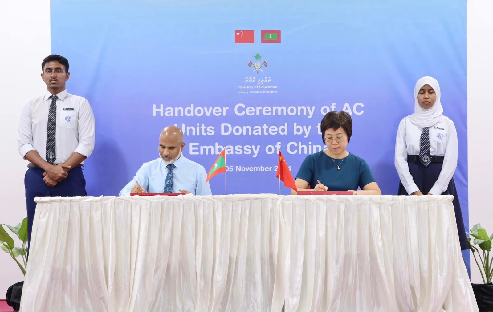 ’ކޫލް ސްކޫލް“ ޕްރޮޖެކްޓަށް ޗައިނާ އިން ހަދިޔާކުރި އޭސީތައް ހަވާލުކުރަން އިއްޔެ ބޭއްވި ރަސްމިއްޔާތެއްގައި ޗައިނާ ސަރުކާރުގެ ފަރާތުން އޭސީތައް ހަވާލުކޮށްދެއްވީ އެ ގައުމުން ރާއްޖެއަށް ކަނޑައަޅާފައި ހުންނަވާ ސަފީރު، ވަންގް ލިޒިން އެވެ. ސަރުކާރުގެ ފަރާތުން އޭސީތަކާ ހަވާލުވެވަޑައިގެންނެވީ އެޑިއުކޭޝަން މިނިސްޓަރު ޑރ. އިސްމާއިލް ޝަފީޢު އެވެ.